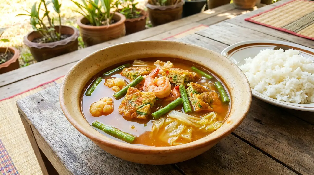 Gaeng som er en vandbaseret thailandsk karry - ingen kokosmælk, bare bouillon - der er sur, krydret og let. Det er hverdagsmad i Thailand, ikke den slags man finder på restauranter i udlandet. Det bedste er stykker af omelet, der suger bouillonen op som en svamp og så frigiver den, når man bider i dem. Revet fisk stødes ind i bouillonen som fortykkelse, så den tynde karry får krop uden at blive tung. Smager endnu bedre dagen efter.