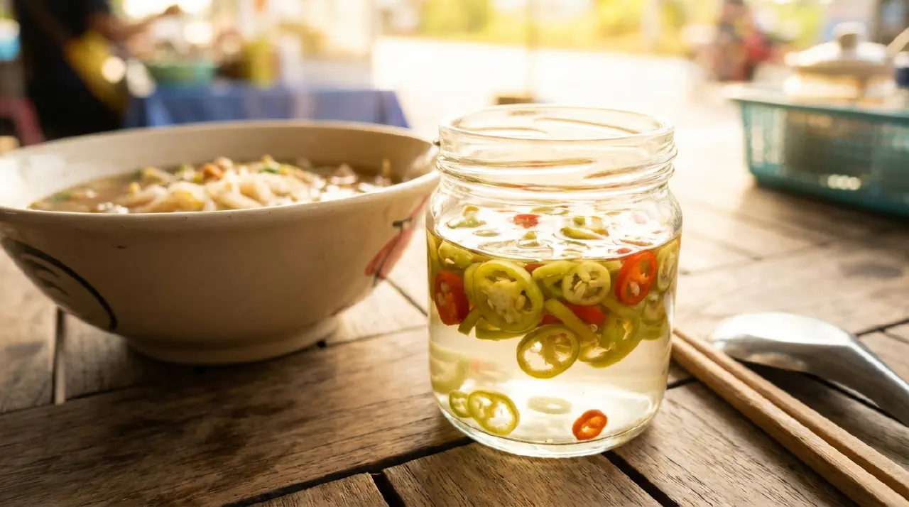 Et af de fire standardtilbehør ved thailandske nudelboder, sammen med sukker, fiskesauce og chiliflager. Det er bare chilier og eddike - syrligheden skærer igennem fede, salte retter som pad see ew og nuddelsupper. Tager ca. 3 minutter at lave, og skal derefter trække mindst 20 minutter før brug.