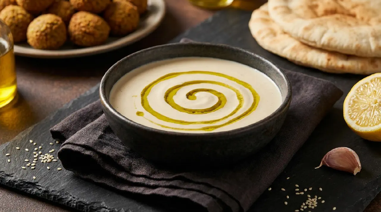 En mellemøstlig basissauce af tahinipasta fortyndet med citronsaft og vand til en glat, flydende emulsion. Findes på hvert bord ved siden af falafel, shawarma, grillet kød og grøntsager på tværs af Libanon, Egypten, Israel, Palæstina og Jordan. Tager under 10 minutter.