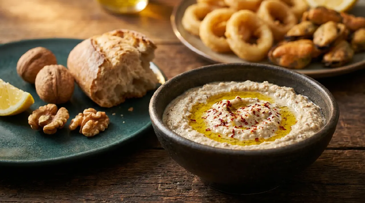 En kold sauce af stødte valnødder, gammelt brød, hvidløg, citronsaft og olivenolie. Den traditionelle dipsauce til stegte blæksprutter og muslinger i Tyrkiet. Teksturen skal have lidt valnøddegrynethed – ikke helt glat.