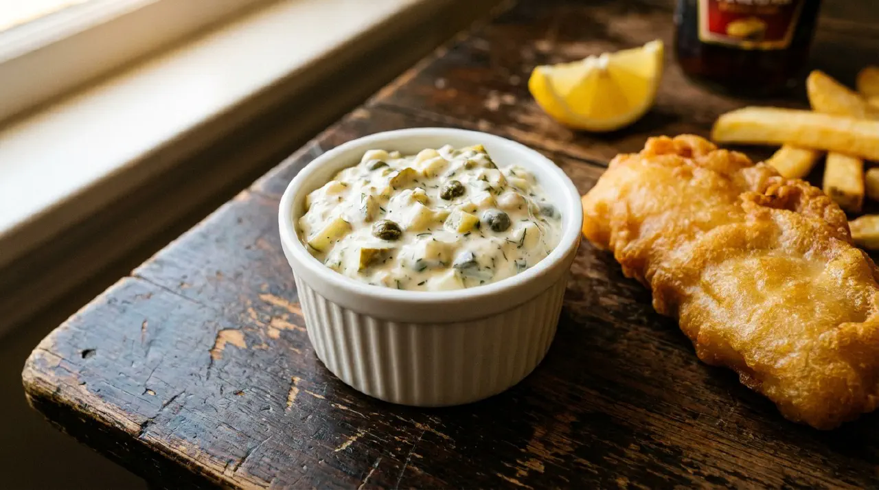 Amerikansk tartarsauce er en simpel blanding af mayonnaise, hakkede syltede agurker og et par smags-tilsætninger. Den har fjernet sig fra den franske original (som er tættere på en remoulade med hårdkogt æggeblomme og purløg) til noget enklere og mere agurkedomineret. Kernen er mayo plus syltet agurk - alt andet er krydderi. Server den til paneret fisk, fiskesandwiches eller fiskefrikadeller.