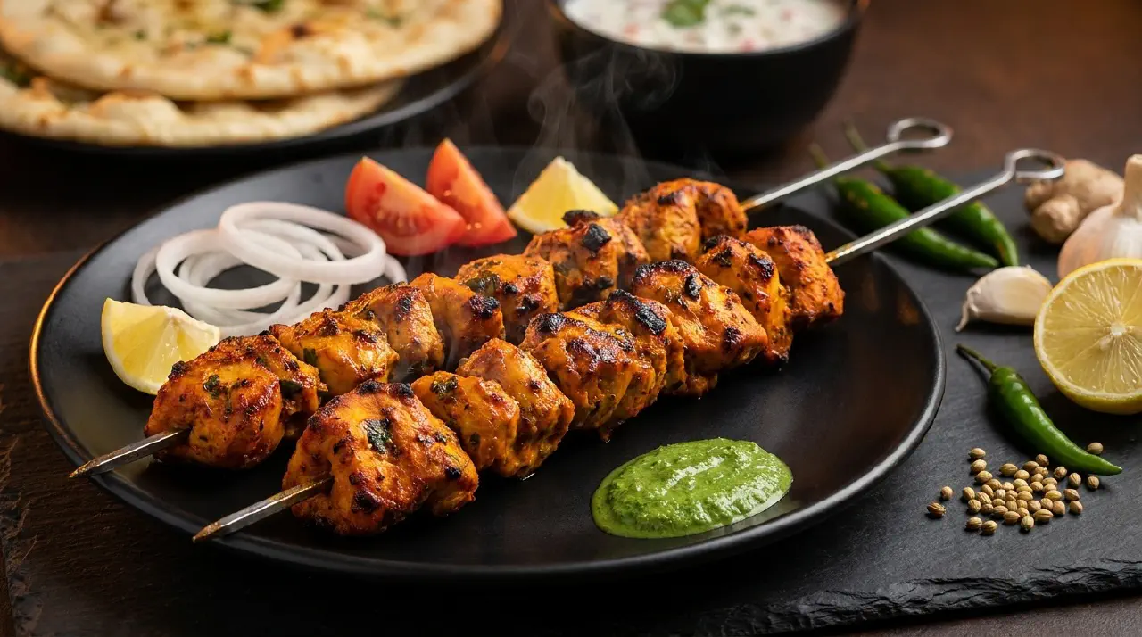 Marinaden er yoghurt med friskrevet ingefær, knust hvidløg, chilipulver, stødte korianderfrø og citronsaft. Yoghurten gør kødet mørt, syren åbner for krydderierne, og olien holder det hele fugtigt under grillen. Kylling er et godt valg her, fordi den magre brystfilet ellers nemt bliver tør, men natten i marinaden løser det.