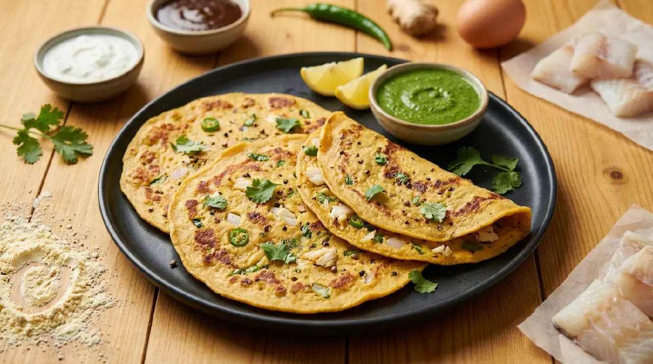 Meen vada er små, flade pandekager af kikærtedej rørt op med stegt torsk, løg, chili og frisk koriander. De hører til den indiske snack-tradition, hvor kikærtemel (besan) bruges som binder i alt fra pakoras til chillas. Her giver melet en let, sprød skal, mens torsken holder indmaden saftig.