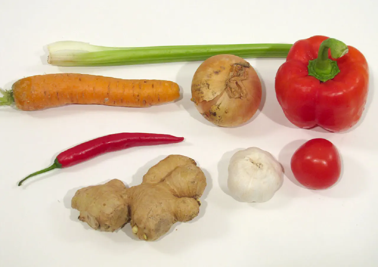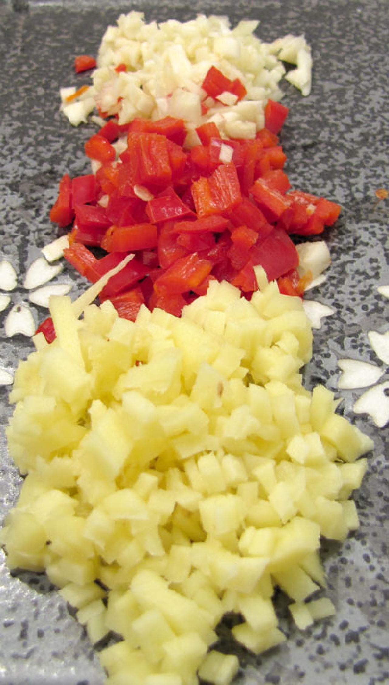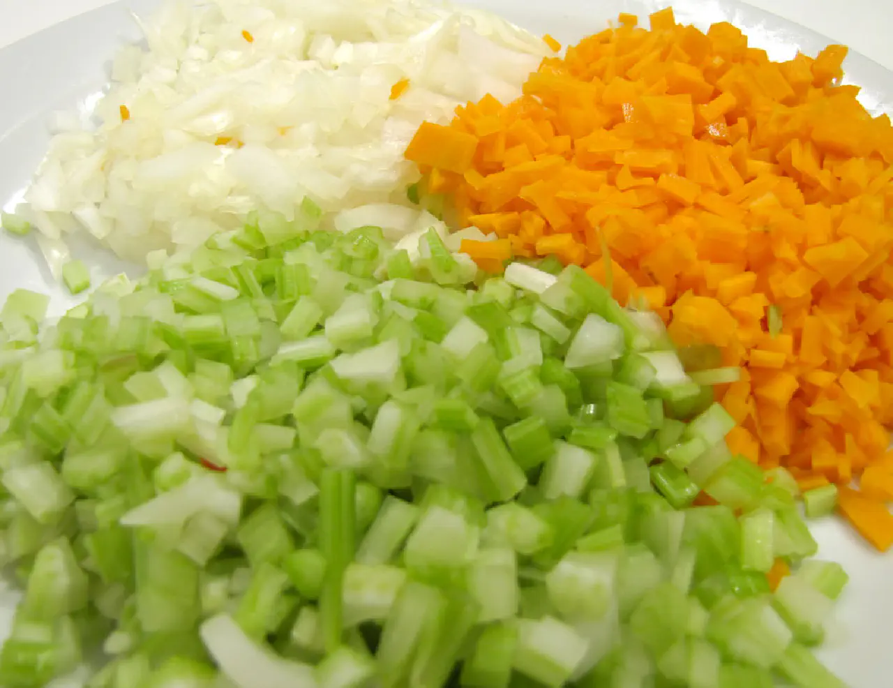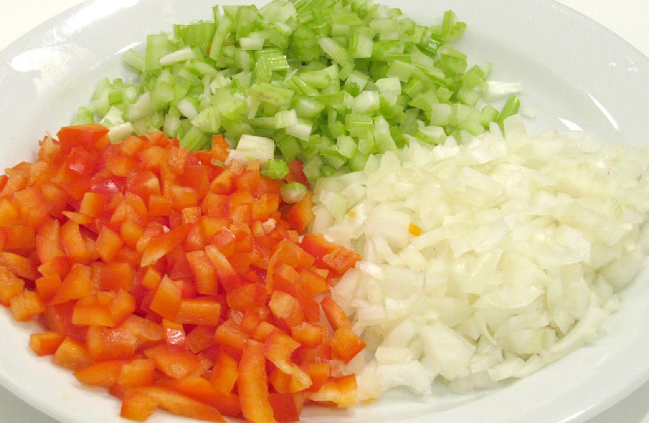 Den helt klassiske treenighed. Grøntsagerne skæres i tern (brunoise), hvor størrelsen er bestemt af hvad der ellers er i retten. Hvis der bruges store stykker kød, så er ternene som regel større.