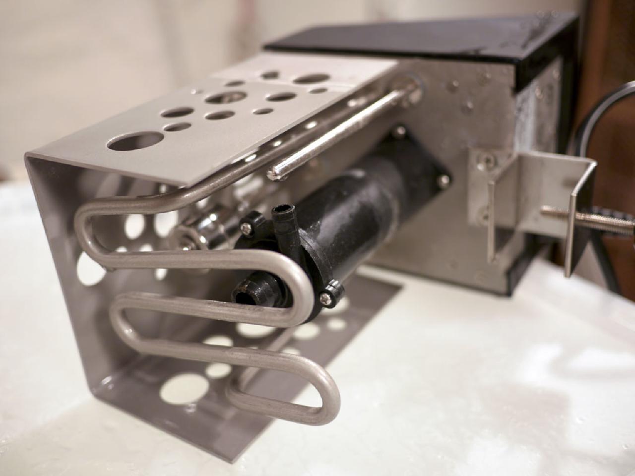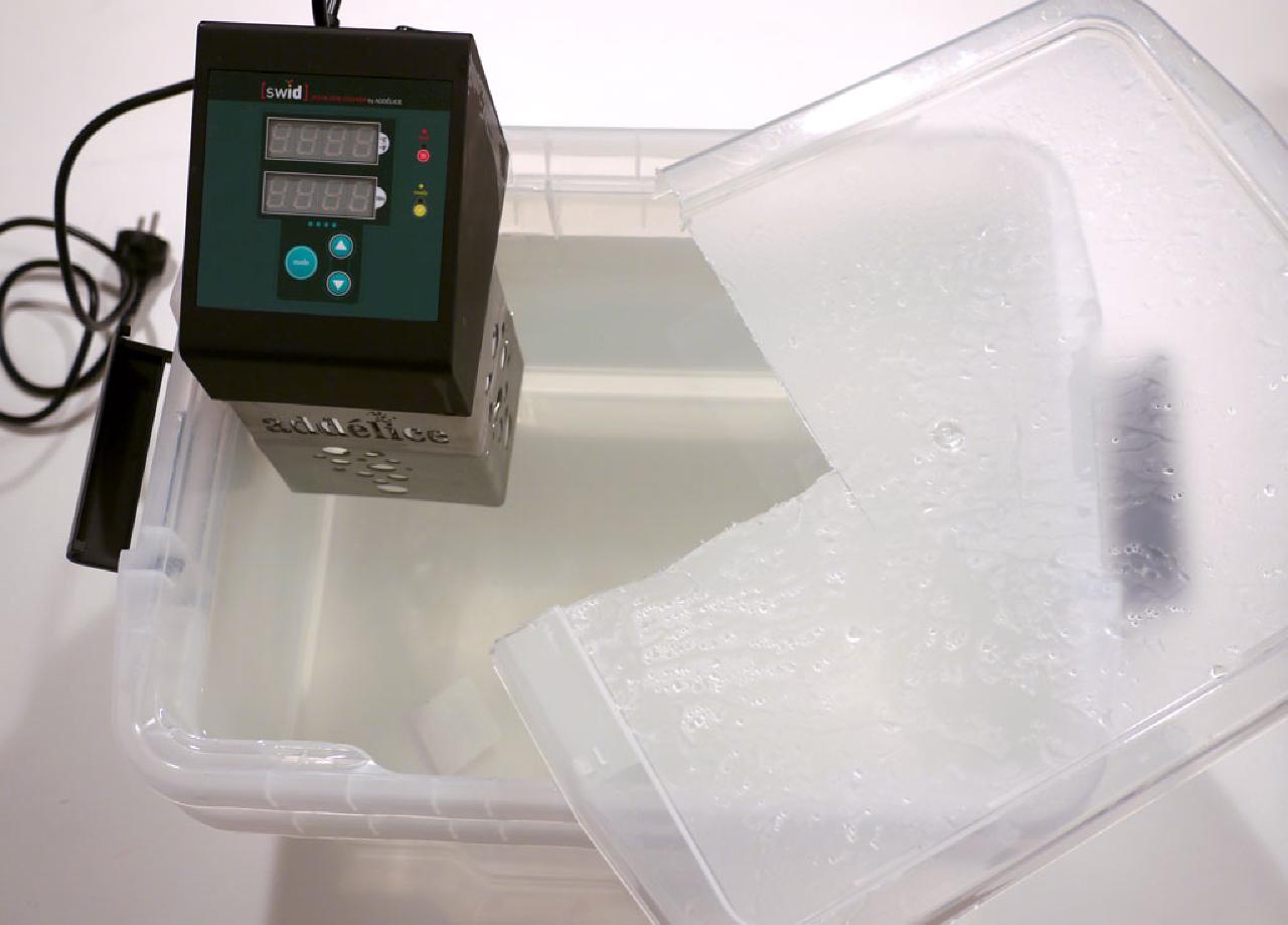 Cirkulationsvarmeren har indbygget PID controller, som selv tilpasser sig størrelsen på ens vandbad. Det gør at den styrer temperaturen helt præcist. Den har også en pumpe som pumper vandet rundt i vandbadet. Derfor har det ens temperatur over det hele. Her er den i en 30 liters plastkasse, så man kan lave absurde mængder af kød på én gang.