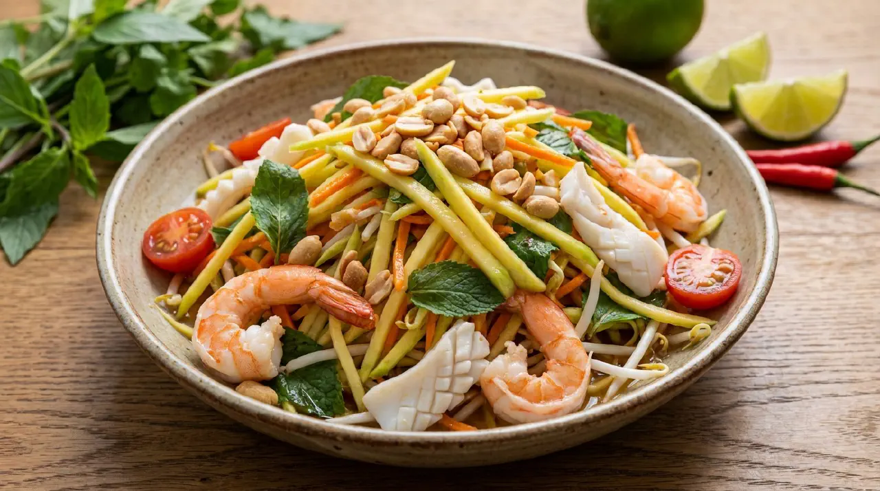 Salad xoài hải sản er en revet grøn mangosalat med rejer, blæksprutte og vietnamesisk koriander (rau răm / laksa-blad). Den skarpe, umodne mango tager en fiskesauce- og limes dressing godt. En god sommerret.