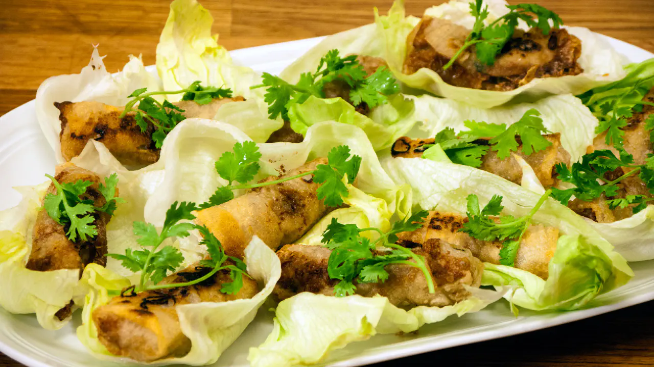 Forårsrullerne i et blad salat og med koriander © kvalimad.dk