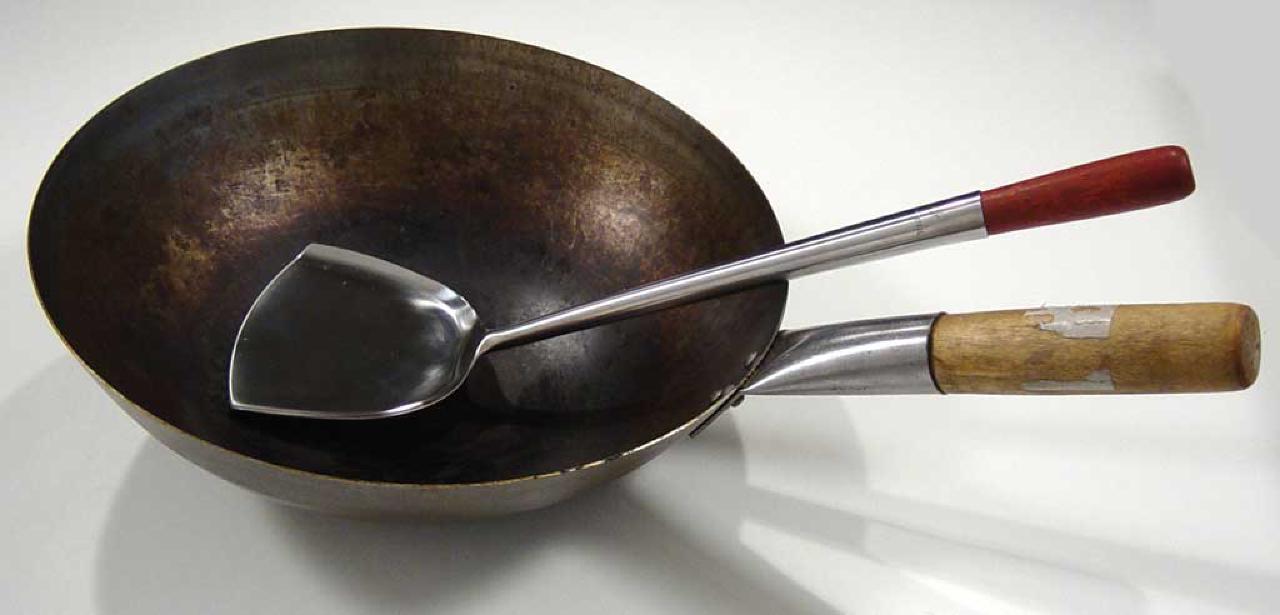 Professionelle wok kokke bruger en lang metalskovl til at røre rundt med. Den er både fin og billig. Jeg bruger min almindelige hulske, og den virker fint.