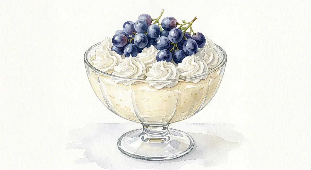 - Kan også serveres med optøet eller henkogt frugt i stedet for druer.